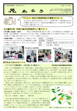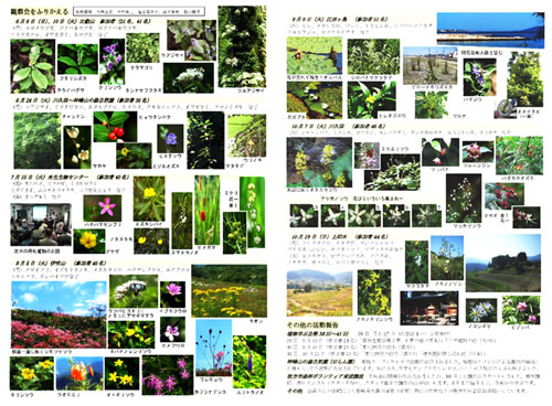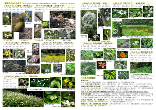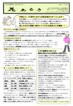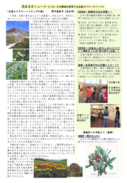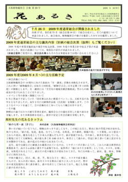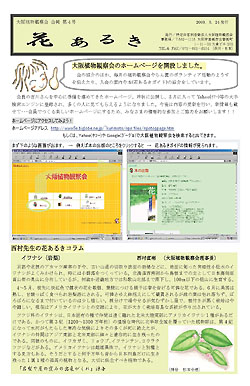 | 第19号 発行/2009.9.18 P1 2009年度通常総会の報告。 2009年の活動予定。 西村先生の花あるきコラム。 P2,3 観察会を振り返る。 その他活動報告。 P4 花あるきニュース。 樹木医澤田さんの診断室Q&A「モミジの変色とテッポウ虫」。 |