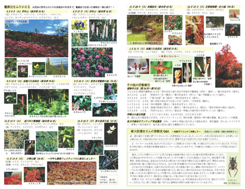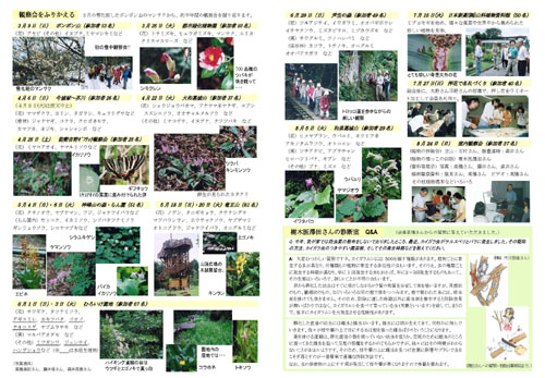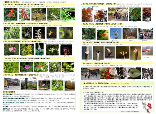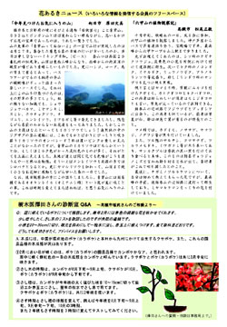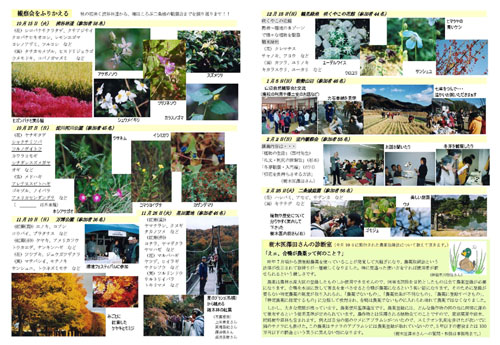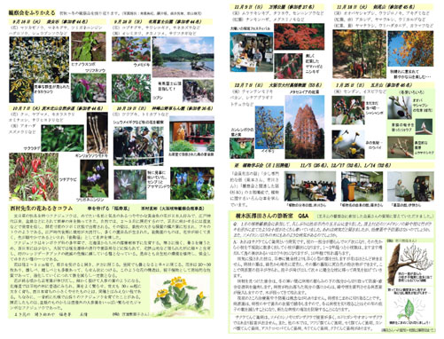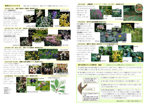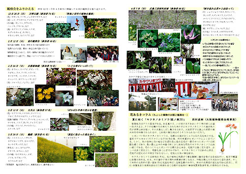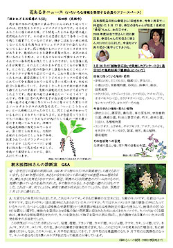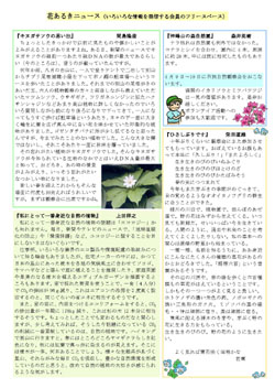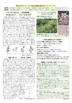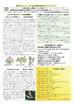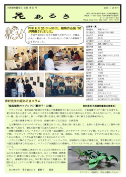 第11号 発行/2006.01.28 (同時発行、添付「らんらん便り」第9号) P1 植物作品展’05の報告と様子。 西村先生の『花あるきコラム』。テーマ「緑起植物のヤブコウジ」。 P2,3 観察会をふりかえる。 植物学ぶ会開催記録。 P4 花あるきニュース。 樹木医澤田さんの診断室Q&A「チョッキリムシ」。 |