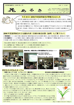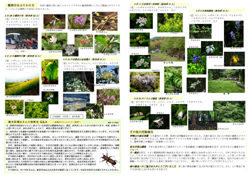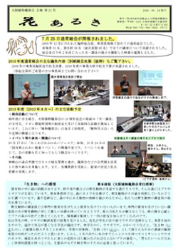 第21号 発行/2010.9.24 P1 2010年通常総会の報告と様子。 コラム『「生き物」への感情』。 P2,3 観察会を振り返る。 樹木医澤田さんの診断室Q&A「ナラ枯れ」。 その他活動報告。 P4 花あるきニュース |