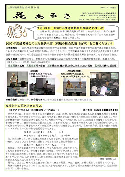 第14号 発行/2007.08.25 P1 2007年度通常総会の報告と様子。 西村先生の『花あるきコラム』。テーマ「カラスウリ−花は繊細なレース編み」。 P2,3 観察会をふりかえる。 その他の活動報告。 幹事メンバーの紹介。 P4 花あるきニュース。 樹木医澤田さんの診断室Q&A「チャドクガ」。 |