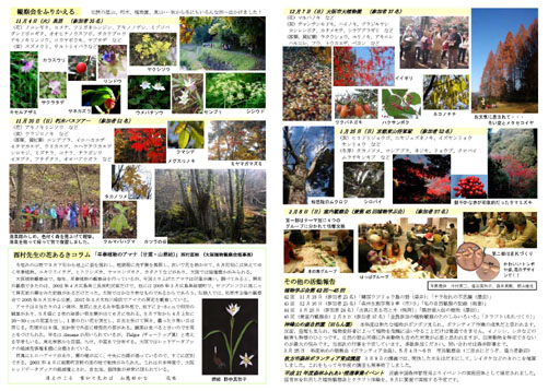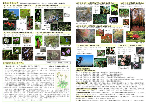 大阪植物観察会が年に数回発行している会報「花あるき」のバックナンバーをご紹介。 会報「花あるき」は正会員にのみ見開きA3版を郵送しています。 会報内で使用している写真や挿絵等は会員の皆さんに提供してもらっています。 通信会員の方からの手紙やイラストの提供があった場合は、提供していただいた号のみですが手渡しもしくは郵送しています。 イベントや会員作品展などの際には、通信会員や一般の方にも楽しんでもらえるように拡大版を会場で展示しています。 会員のみなさんも、手元に届くものと少し雰囲気の違う会報を是非ご覧になってみてください。 |