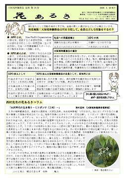 第16号 発行/2008.06.20 P1 「再度確認!NPOは何を目指して活動するの?」(第1号より抜粋)。 西村先生の『花あるきコラム』。テーマ「氷河時代の生き残り−ミツガシワ」。 P2,3 観察会をふりかえる。 作品展’08アンケート結果。 その他活動報告。 P4 花あるきニュース。 樹木医澤田さんの診断室Q&A「ワラビのアク抜き」。 |