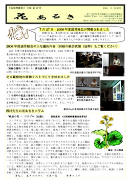 第17号 発行/2008.11.25 P1 2008年度通常総会の報告と様子。 10周年植物リスト作成の報告。 西村先生の『花あるきコラム』。テーマ「晩秋の花−ツワブキ−」。 P2,3 観察会を振り返る。 その他活動報告。 P4 花あるきニュース。 樹木医澤田さんの診断室Q&A「ボケの挿木」。 |