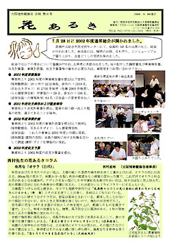 第3号 発行/2002.09.30 (同時発行、添付「らんらんだより」第1号 らん園の作業が始まって、作業の様子を「らんらん便り」として会報と一緒に送付開始) P1 2002年度通常総会の報告、様子。 西村先生の連載『花あるきコラム』 テーマ「有用な-オケラ」 P2、3 観察会をふりかえる。 新連載『樹木医澤田さんの診断室』Q&A。 会員からの樹木に関する質問や相談に樹木医澤田さん(会員)が答えてくれるコーナー。 初回の質問はサクラの枝の切り方でした。 P4 花あるきニュース。 |