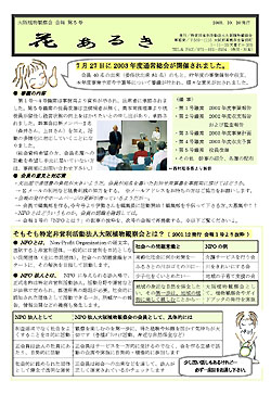 第5号 発行/2003.10.20 (同時発行、添付「らんらんだより」第3号) P1 2003年度通常総会の報告、様子。 NPOとは?(会報第1号より抜粋)。新入会の会員が増えてきたので再度掲載。 P2、3 観察会をふりかえる。 樹木医澤田さんの診断室Q&A「カイガラムシの駆除方法」。 P4 花あるきニュース。 西村先生の連載『花あるきコラム』。テーマ「京・貴船の名花-シュウメイギク」。 |