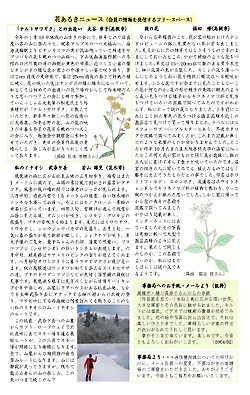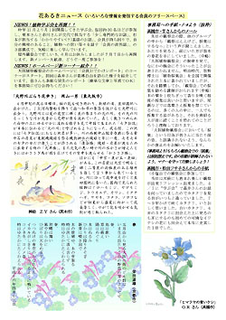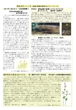 第4号 発行/2003.03.24 (同時発行、添付「らんらん便り」第2号) P1 大阪植物観察会のホームページ開設をお知らせ。 西村先生の連載『花あるきコラム』。テーマは「イワナシ」。 P2、3 観察会をふりかえる。 樹木医澤田さんの診断室「合鴨農法」について。 P4 花あるきニュース。 |