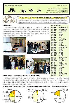 第6号 発行/2004.02.25 (同時発行、添付「らんらん便り」第4号) P1 植物作品展(会員展)の報告と様子、来場者の声(アンケート回答)。 P2、3 観察会をふりかえる。 西村先生の連載『花あるきコラム』。テーマ「春を告げるー福寿草」。 樹木医澤田さんの診断室Q&A「てんぐ巣病」 P4 花あるきニュース。 |