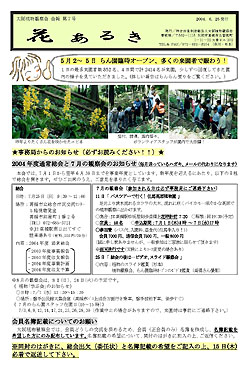 | 第8号 発行/2004.10.25 (同時発行、添付「らんらん便り」6号) P1 2004年度通常総会の報告と様子。 西村先生の『花あるきコラム』。テーマ「箱入り娘−ほおずき」。 P2、3 観察会をふりかえる。 樹木医澤田さんの診断室Q&A「ハダニ」 P4 花あるきニュース。 |