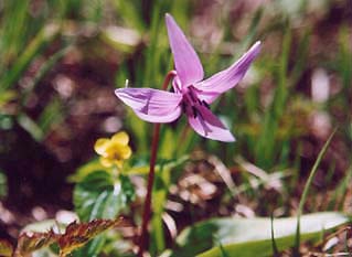 喘ぎながら頂上まで登ってみると、何とカタクリが群生しているではないか。 雪渓の消えた斜面には雪に押しつぶされたススキのような枯れ草が広がり、まだ 短い若草の中にカタクリが群生している。カタクリの生育環境は落葉樹林が一般的 であり、日照100パーセントの山頂では見たことがない。 所々にオオバキスミレが散りばめられ、ショウジョウバカマも元気である。 今年のザゼンソウは4〜5株見えるだけである。登りで見かけた大きなものでなく、 15cmくらいの赤い仏炎苞を被った誠に可愛いものである。 2年前の6月2日に登ったときには雪渓があり、カタクリ、オオバキスミレとも、もう少 し花が大きく色も鮮やかであったように思う。今年は思いのほか春が早かったようで ある。 カタクリ、キスミレともここ2〜3日が最後のチャンスか、少し色アセて林のない炎天下 では誠に可愛そうである。 |