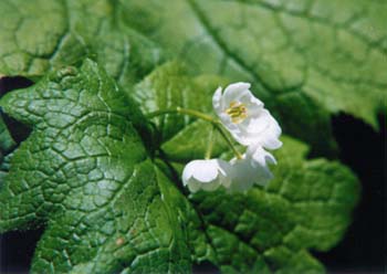 ブナの疎林が谷底に向かって広がっている。大きい木は周囲1mくらいはありそうだ。 白い肌に苔や地衣が張りつき、枝ぶりもブナの風格をしている。 雪国のブナは木肌を見れば積雪量がわかるといわれるが、よく見てもわからない。 ブナの木の間から頂上がよく見える。 しかし頭に描いていた雪渓が見当たらない。 そればかりか、えぐられたような赤土のザレ場が見える。これではカタクリやオオバキ スミレ、ザゼンソウは望めそうもない。ガッカリである。 最後の急斜面を登っていくと、両側にザゼンソウの大きな葉っぱが沢山生えていた。 すでに仏炎苞はなく葉っぱも30cmくらいに成長しており何の風情もない。 時折サンカヨウの蕾や茶色になったヤグルマソウの葉っぱが気分を変えてくれるくらい である。 |