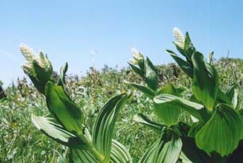 | 頂上に上がってみると、登ってきた稜線にムラサキヤシオがチラホラと見え、東側 の急斜面には白い花を咲かせたサンカヨウの大群生が見える。300oのズームで は足りない。 草地の斜面を下り近づいてみたい衝動に駆られるが千尋の谷、グット我慢である。 遠くには雪を被った加賀白山、御岳、荒島、冠等の山々がはっきりと見える。 稜線を少し西に歩くとコバイケイソウの群落が咲き始めたばかりである。花は期待 できそうもないがニッコウキスゲの株も沢山見える。 |